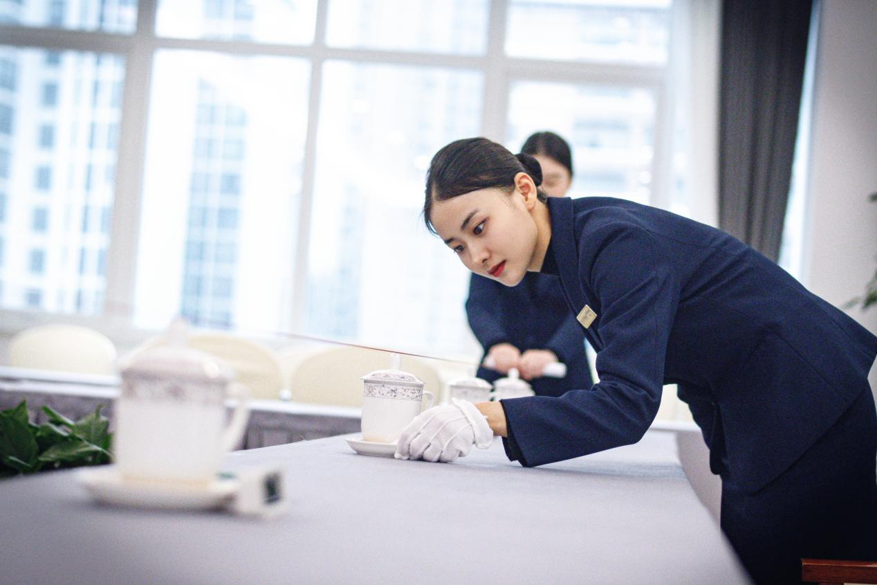 安逸酒店集團(tuán)團(tuán)員青年整理餐桌