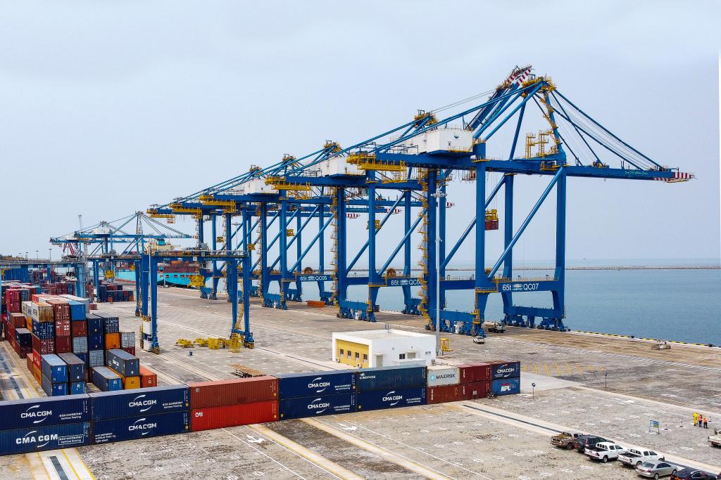 這是2月21日在喀麥隆南部大區的克里比拍攝的喀麥隆克里比深水港二期照片(無人機照片)。由中國港灣工程有限責任公司(中國港灣)承建的喀麥隆克里比深水港二期工程交工儀式21日在克里比深水港碼頭舉行。新華社發(科普索攝)