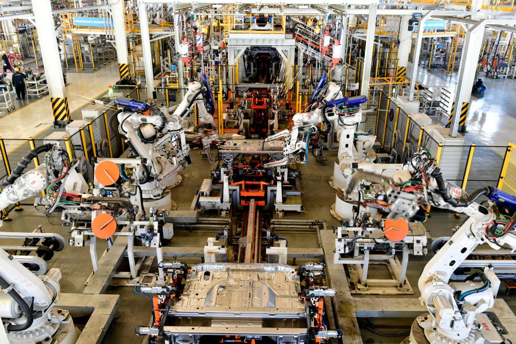 1月9日,在位于日照市五蓮縣的五征集團汽車焊裝車間,工業機器人在焊裝車身。新華社記者郭緒雷攝
